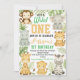 Celebrate your little one's first birthday with this adorable "Wild One" jungle safari-themed invitation! Featuring cute watercolor animals like a monkey, elephant, tiger, giraffe, zebra, lion, and hippo, surrounded by lush tropical leaves, this invitation is perfect for a fun and wild first birthday party. Personalise it with your child's name, date, time, and party location. Ideal for a boy or girl's jungle-themed party.