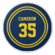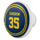 This ceramic knob features a sporty font and round stripes border with editable colours (click customise, select "VarsityStripesRound1" and change each of the stripe colour to a colour of your choice) against a background colour that is also editable (click customise and change background colour).