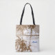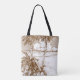 A tote with custom script letters in blue and tropical vintage art of palm trees on a sandy beach and beautiful clouds over calm ocean waves in dark brown.