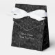 Editable favor boxes with elegant script letters in white on a vintage floral damask pattern in dark grays on black.