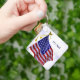 A custom keychain with a vintage etching of a US flag in retro red, white and blue, flying proudly on a flagpole topped with an American eagle and a rope with a tassel, with a rustic white and light blue background.