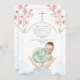 This heartwarming design beautifully combines soft watercolor florals in shades of pink, a subtle cross motif, and delicate blue accents. The centerpiece features an adorable sleeping baby, gently cradled in loving hands, symbolising new life and divine blessing. The cherished scripture from Jeremiah 1:5, "Before I formed you in the womb I knew you," adds a profound spiritual touch. This invitation is perfect for inviting loved ones to witness and celebrate this significant milestone.