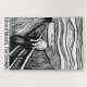 The Scream jigsaw puzzle. Black and white version of the famous painting by Munch with the name of this artistic masterpiece along with the artist's name printed at the bottom. This large puzzle is 20x30 inches big and it's made of over 1000 pieces.