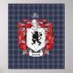 Welsh descent version of this Heraldry Crest in red, black and silver grey features the Edwards Family Coat of Arms. This design would make a unique family gift idea. Shield displays ermine background with black lion rampant. Silver wyvern (dragon) Crest above. Edwards blue and grey tartan background.