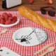 A spider dangling from the word 'Eeeek!'. A cute plate for a Halloween party.