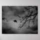 Eerie Bird in Flight - Dark and deary black and white photo with tree branches and black bird in flight.