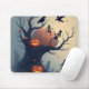 An atmospheric, eerie Halloween scene. A gnarled tree is filled with glowing jack-o'-lanterns, skeletal figures, and black crows against a misty sky. Perfect for a spooky holiday mood