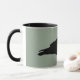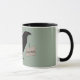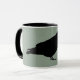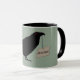 Mug with my original digitally created image of a raven or crow. The raven is ink black with blood-red eyes. He holds a chain in his mouth from which hangs a time-worn note reading "Nevermore". He stands against a grayish-green background with fine, tone-on-tone, wavy lines. A very literary way to enjoy your coffee or tea at Halloween or most any other time. This design can be used on any of a number of different mugs, glasses and steins.