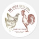 Swap out those boring egg carton labels for something as fresh as your farm eggs! This label depicts two hens and a rooster with a border announcing the number of eggs from pastured hens and your farm name and contact information.