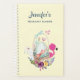 Personalised pregnancy planner, keep track of all your doctor appointments, nutritional information and other important reminders. Illustrated with a cute watercolor painting of a pale green egg sitting inside a wicker basket. Decorated with ribbons, bows, flowers and little hearts. A pink flamingo and white bunny rabbit by its side.