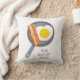 A throw pillow with a cute brekkie bacon and sunny side up egg in heart shape on a kitchen saucepan. Pun text reads "We are Eggcellent together!"