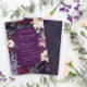 Romantic flowers in shades of rich burgundy, gentle lilac, deep eggplant purple and pinkish orchid pair with modern green botanicals such as ferns and eucalyptus. A dark, eggplant purple watercolor background ties it all together with classic typography in these elegant wedding invitations.