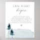 This late night baby shower game sign features rustic slate blue winter pine trees and watercolor splashes and handwritten fonts. It is the perfect baby shower sign for your boho, rustic, mountain, or forest baby shower.