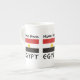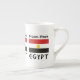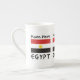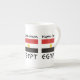 Design, on bone China mug, features the Egyptian flag with the word EGYPT underneath in black letters. There is a place to put your name for a personalised touch. Or, add someone else's name for a customised gift. Design shows on three sides of mug. The flag is red, white, and black.