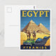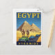 Blend ancient history with mid-century adventure with this unique retro travel postcard for Egypt. The design features the majestic Pyramids of Giza serving as the backdrop for a classic road scene, complete with vintage cars and travelers riding camels. This vibrant, stylized artwork is perfect for lovers of bold graphic design, historical landmarks, and the glamour of 20th-century exotic travel.