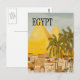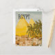 The great pyramids in the background, a city done in sepia colours and graceful palm trees in the foreground.