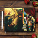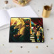 Egyptian Queen with red dragon on her shoulder. The Queen is holding an orb of a universe. A black lion with wings is on a mountain with a sphinx in behind.