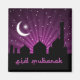 Eid Greeting illustration with silhouettes of the moon, stars and a mosque on a purple night sky.