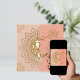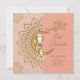 A beautiful and elegant Arabic calligraphy geometric pattern Eid Mubarak greeting card. Design features a beautiful crescent, islamic hanging lanterns, geometric islamic pattern, Arabic calligraphy, islamic mandala on pink peach background. Send your best wishes to your family, friends and loved ones by our beautiful and elegant designs greeting card. It has a beautiful Eid wishes and back side golden Arabic Shahadah Calligraphy. If you want you can easily change or remove by clicking personalised this template.