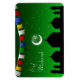 Eid Mubarak greeting illustration with a festive and colourful garland in a magic night scene with a mosque silhouette and the moon and stars on a green night sky.
