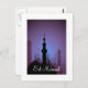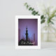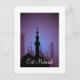 A postcard for Eid festive featuring many mosques overlaying silhouettes in blue background with circular gradient.