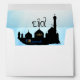 Black silhouette of a mosque on a blue sky with sun and sunrays, greetings and wishes for Eid.