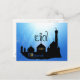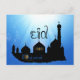 Black silhouette of a mosque on a blue sky with sun and sunrays, greetings and wishes for Eid.