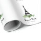 This elegant wrapping paper says "Joyeux Noël" in French black modern typography, along with an image of the Eiffel Tower surrounded by green Christmas pine branches and pine cones. Personalise with your name. We have used some art from LABFcreations.