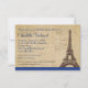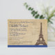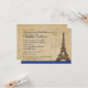 Start off a romantic Parisian themed bridal shower with a unique invitation meant to look like a postcard from a bygone era. The background is reminiscent of an aged letter with subtle engraving, cursive handwriting and visa and postage stamps. The Eiffel Tower is dominant on top of a blue panel. The paper background is repeated on the reverse to highlight extra information for your guests. Available with matching products.