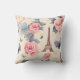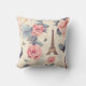 A pillow with an elegant pattern. Pink roses, blue-grey butterflies and an Eiffel tower. A French themed pattern.