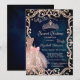A modern, chic and glamorous invitation with an elegant gold tiara, dress, Eiffel Tower, and glitter butterflies on a blue background.