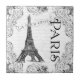Black and white illustration of the Eiffel Tower and fancy scrolls. Paris is written in strong print on the side. Lovely design for gifts and cards.