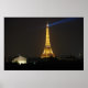 This is a photo of the Eiffel Tower in Paris, France. This photo was taken at night. La Tour Eiffel is illuminated at night, lighting up the City of Light. A beacon rotates around the top of this famous and popular tourist attraction. The Eiffel Tower is an iconic Parisian landmark.