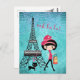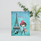Eiffel Tower Paris Girl and Cat Blue Damask Postcard