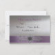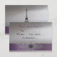 This fancy response card (rsvp) with Paris flair incorporates a silhouette of the Eiffel Tower, sparkly vintage floral trim, and purple and silver metallic shine. Shown on basic paper, but you can upgrade to match your invitations.