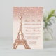 A modern, chic and glamourous sweet sixteen with a hand drawn rose gold glitter french Paris theme Eiffel Tower with rose gold glitter ombre gradient sparkles on an editable pastel blush pink background with real rose gold foil.