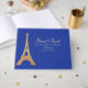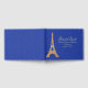 Paris themed Sweet 16 party guest book done in a royal blue on blue pattern, with graphics of a gold glitter looking Eiffel tower. Personalise the text fields for your special day.