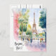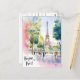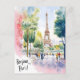A vibrant watercolor painting depicts the Eiffel Tower in Paris. The iconic landmark stands tall against a backdrop of lush green trees and a bustling Parisian street filled with people. The artwork captures the charm and beauty of the City of Lights.