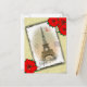 Slightly distressed looking framed and stamped vintage image of the Eiffel Tower. At top three poinsettias are clustered togerther. At bottom left one poinsettia sits next to "Joyeux Noël"