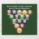 A set of billiard balls in shiny hues of yellow, blue, red, purple, orange, green, tan and black, with green background to resemble a real pool table. The balls are arranged in one of the proper racks in standardised eight-ball: two rear corner balls in different suits, 8 ball in the centre and apex ball on the foot spot. A fun and colourful recreational illustration for the cueist, pool player, billiard player, snooker player or cue sportsman in your life. Also makes wonderful decor for a man cave, game room, billiards parlour, pool hall, bars, tavern, pub or bachelor’s party. Customise with your names, favourite quote or other text.