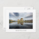 Photo postcard of historic Eilean Donan Castle on a quiet morning with reflection in the still water at the western coast of Scotland, near Isle of Skye with a white border and the text 'Scotland'.