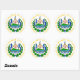 Over it is a rainbow which means peace. Behind the coat of arms there are five flags representing the flags of the Federal Republic of Central America raised. Under it, there is a scroll which states the national motto of El Salvador: Dios, Unión, Libertad (Span., "God, Union, Liberty"). All of this is surrounded by a laurel garland, which is tied together under the national flag. The garland is divided into 14 different parts, which symbolise the 14 Departaments, the Salvadoran subnational administrative units. All this is surrounded by golden letters, which form the Spanish words REPÚBLICA DE EL SALVADOR EN LA AMÉRICA CENTRAL (English: Republic of El Salvador in Central America).