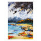 A seascape with a beach area in the foreground, calm turquoise water, and a range of mountains in the background. The sky is dynamic, with dark, heavy clouds contrasting with bright white and yellow accents, adding a sense of movement and drama to the serene landscape below.