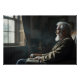 Photorealistic portrait of an elderly man with white hair and a neatly trimmed beard, seated alone in a deep brown leather armchair. He gazes wistfully out of a nearby window, illuminated by soft natural light that highlights his profile and dust motes in the air. The surrounding room is cozy yet dimly lit, evoking melancholy and introspection. A closed book rests nearby, emphasizing quiet contemplation and solitude.