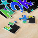 This vibrant and lively birthday-themed jigsaw puzzle design has the message "HAPPY BIRTHDAY, ELEANOR" with the characters having a colourful rainbow spectrum inspired gradient pattern, along with a fun field of stars background pattern. A vibrant puzzle like this might be used to send a birthday greeting message to somebody named Eleanor. [~Z0000468]