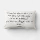 Inspirational quote throw pillows; this black and white pillow features the Eleanor Roosevelt quote: "Remember always that you not only have the right to be an individual, you have an obligation to be one." Features an abstract black background design on the back.