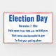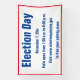 A blue text template appears on this white banner that has a red border. You can edit or delete text to customise your message. As shown, the top line says Election Day. The second line has a date that can be changed. The third line shows the hours for the polls. Text for a website appears on the fourth line. The final line is for a custom message (shown: To find your polling place).