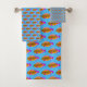This set of towels features bright orange and pink tropical fish on a background of line art and a beautiful ocean blue.