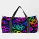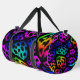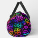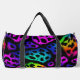 This image features a duffel bag adorned with a striking and stylised leopard print pattern. The spots are filled with a vibrant, gradient-like texture that mimics the appearance of colourful fur or threads, transitioning through shades of pink, purple, blue, green, and yellow/orange. These vivid colours stand out dramatically against a solid black background. Black carrying straps are prominent across the top. The design gives the bag a dynamic, modern, and artistic feel, making it a bold accessory for travel or everyday use.