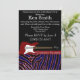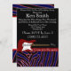 Perfect fun Birthday Invite , in a present of friends. This zebra animal print card #16 will make any Birthday the best ever to remember, with the red blue and white invitation. Red electric guitar and a red stripe across. Use our easy template to customise with your party details.
